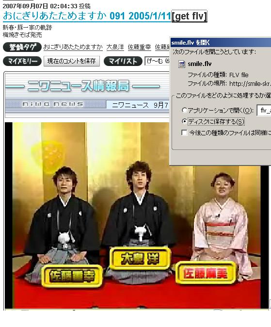 1.ニコ動にログイン〜ニコ動TOPページが開く 2.ブックマークしてある「おにぎりあたためますか‐キーワード検索」のページを「新しいタブで開く」 (キーワード検索を「投稿日時が新しい順に表示」にしているので、新しい投稿があった場合はページが開いたらすぐ判ります) 3.TOPページのタブに戻り〜ログOUT 4.新しいタブで開いた「おにぎりあたためますか‐キーワード検索」のページに戻る〜目的のファイルを右クリック「リンクのURLをコピー」 5.ゲッター1起動〜ダウンロード